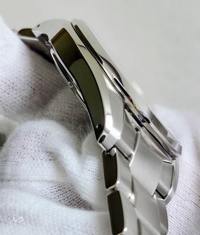 松葉のような時分針には、鏡面仕上げと筋目仕上げが交互に施されているため、ちょっとした動きでキラリと光りが動くのが、わかります。