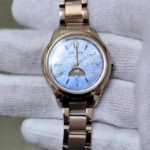 白蝶貝のダイヤルにグレービングされた水面がグラデーションを描いて、ブルーから夕焼けを思わせるピンクに変化する。
