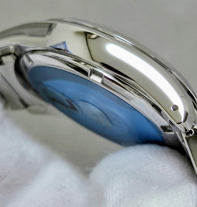 シャープな稜線で多面取りされたインデックス、時分針、そして