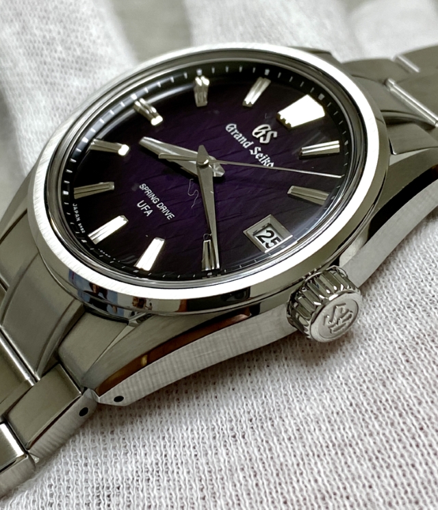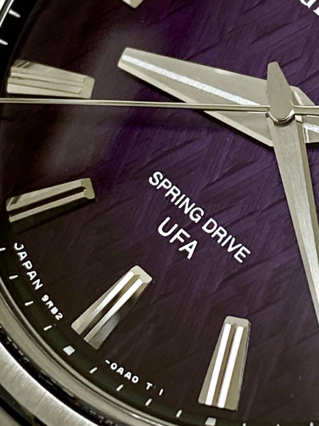 神秘的な夜明けの情景を表す紫の文字盤カラーが特徴的であると同時に
