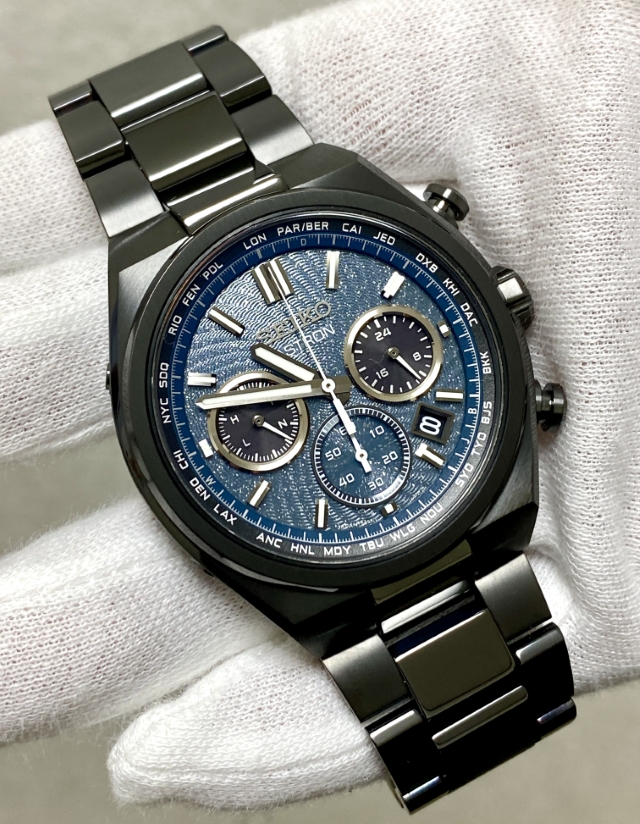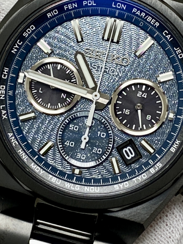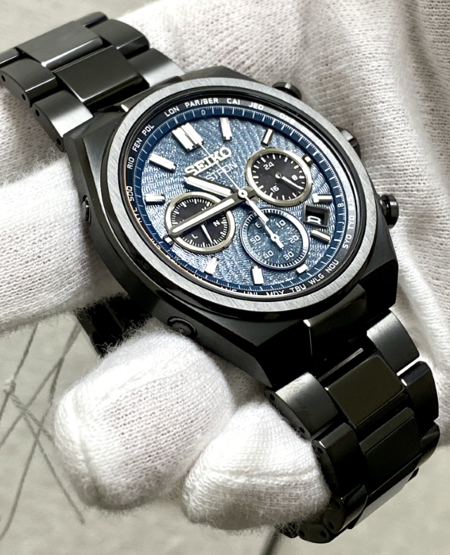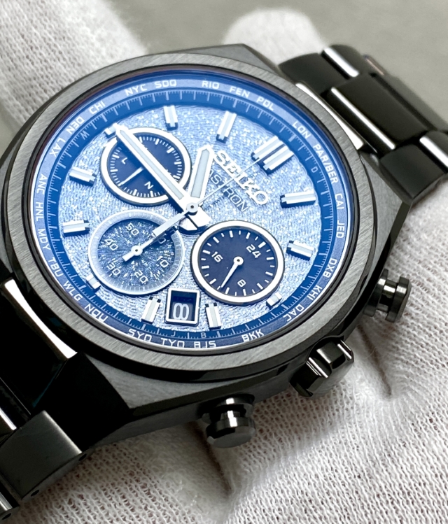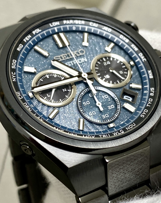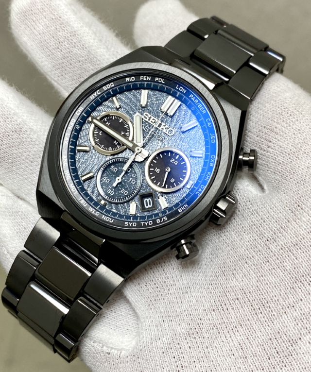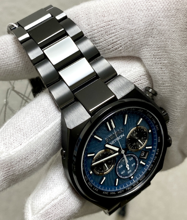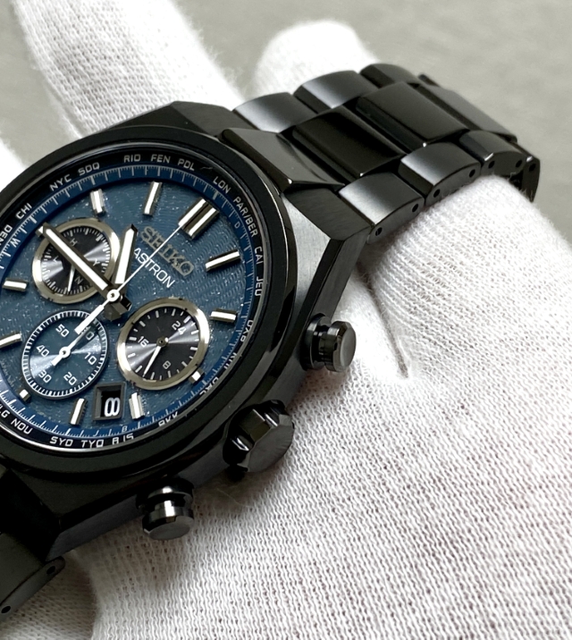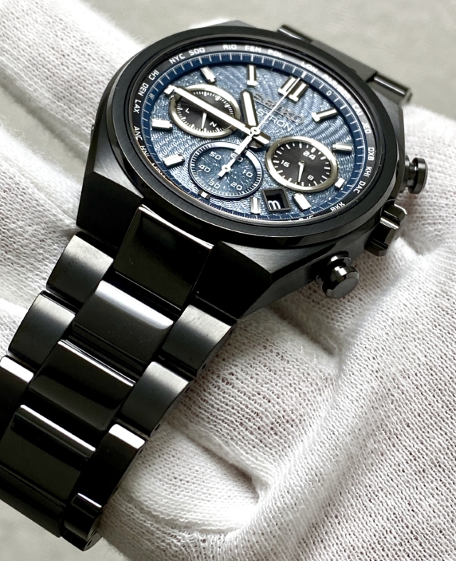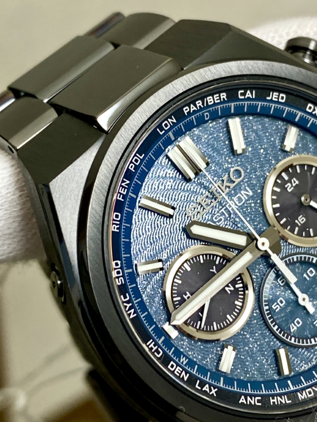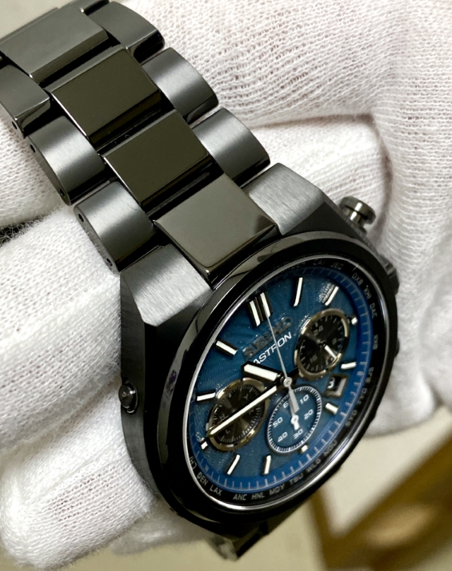 ながらもブラックベースの筐体と濃いグリーンにもブルーにも見えるダイヤルの色合いとが宇宙の奥深い雰囲気を我が手首上に演出する