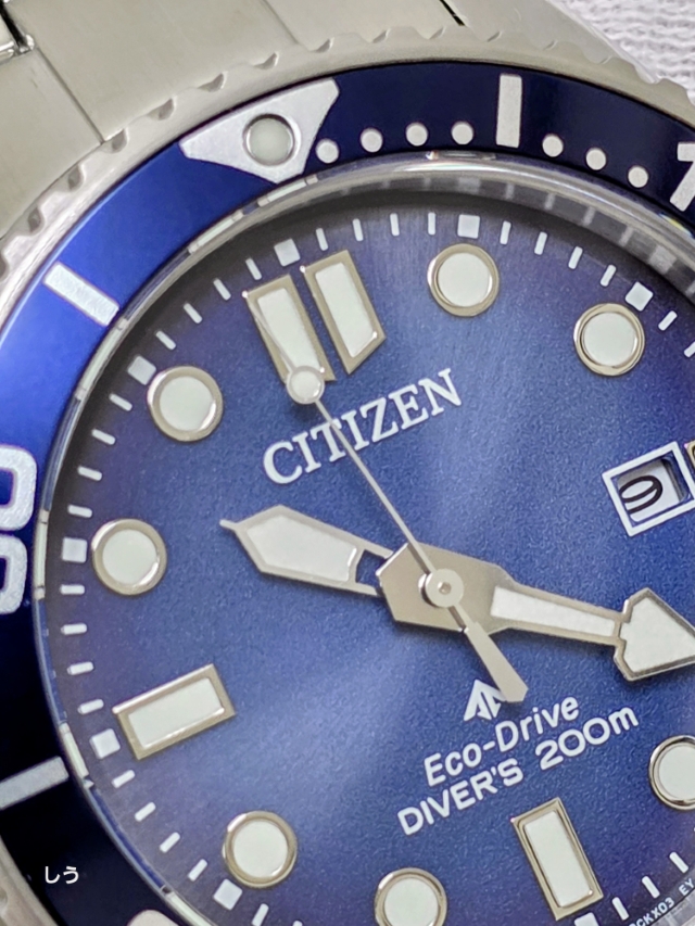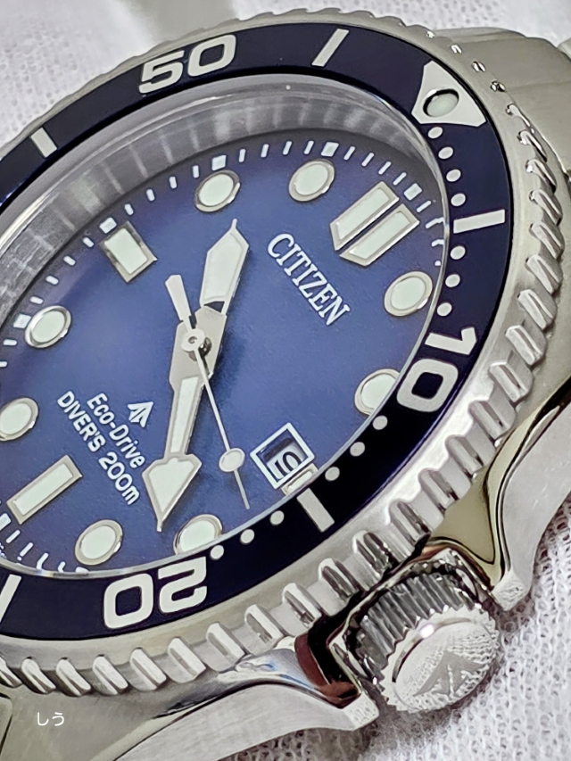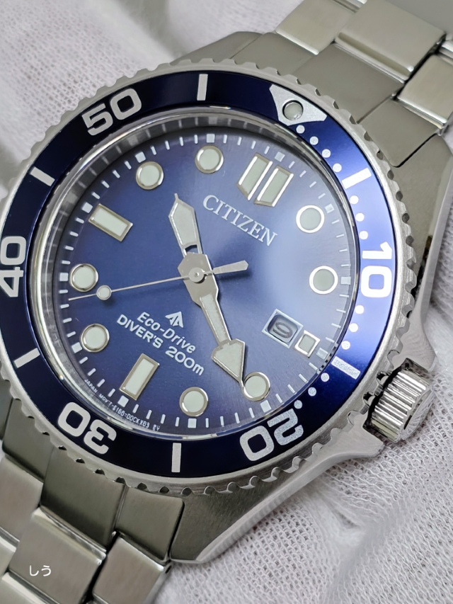 深い海を思わせる濃いブルーのダイヤルとベゼルのコンビネーションが