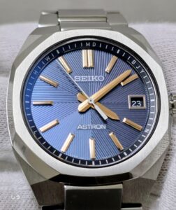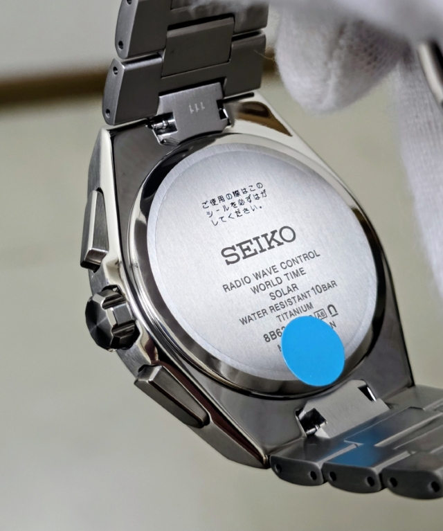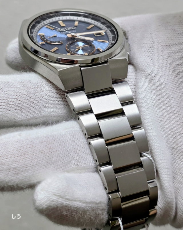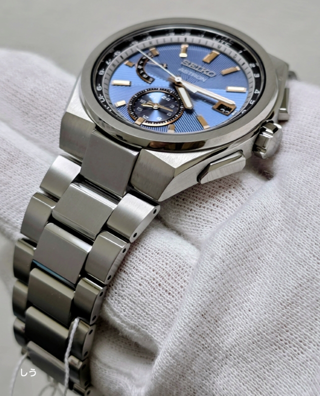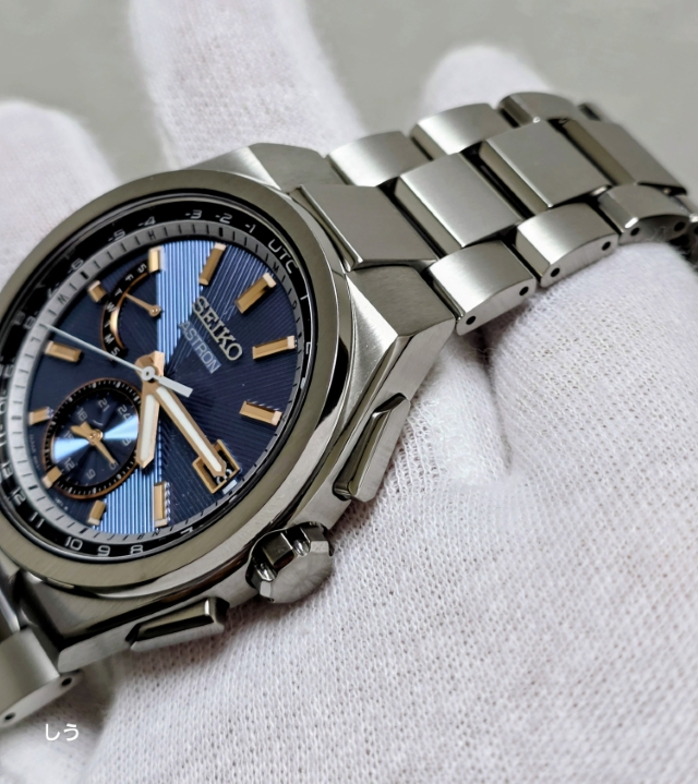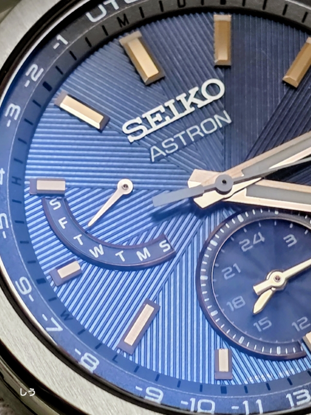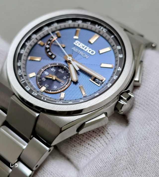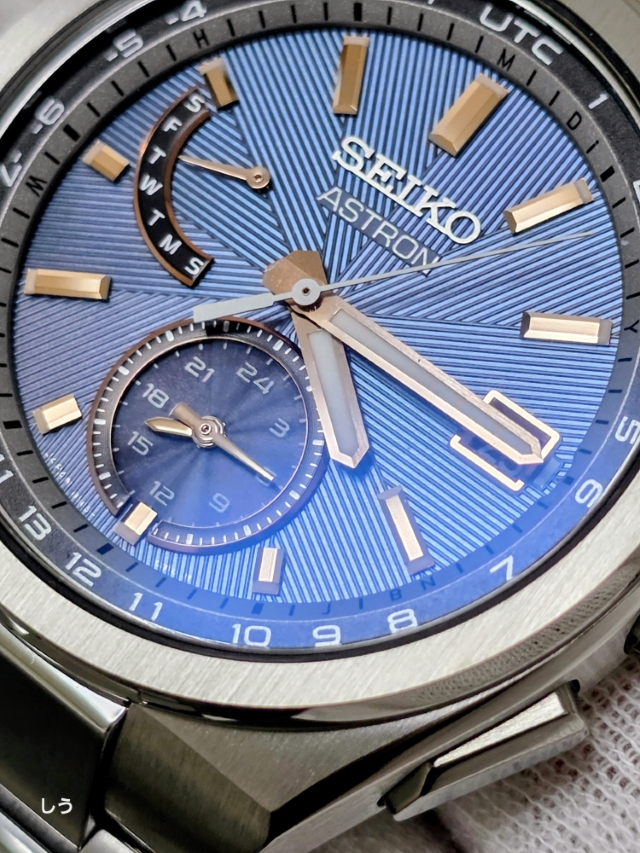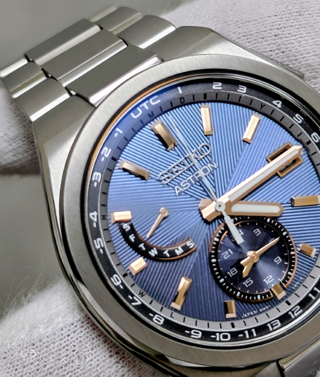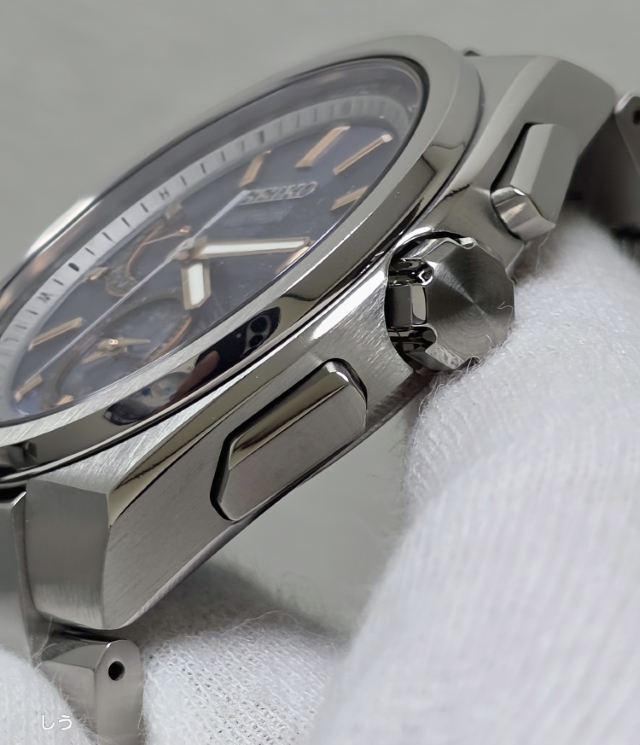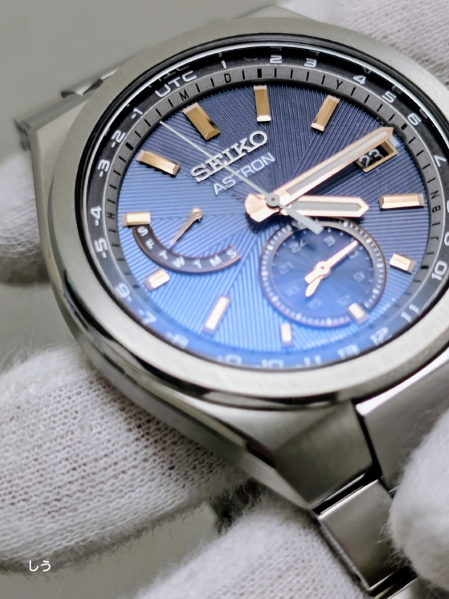 アストロンらしい幅広のベゼルに筋目仕上げが施されることで、セラミックのベゼルとはまた違った、落ち着いた雰囲気になっているのを確認できる。